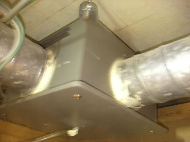 これは中間ダクトファンと呼ばれる換気扇で、天井に完全に埋め込まれて隠れているので、リフォーム業者は交換しないで良いと判断したのでしょう。 この点難しいですね。マンションを購入する方は、こんな天井裏まで見ないですから。
