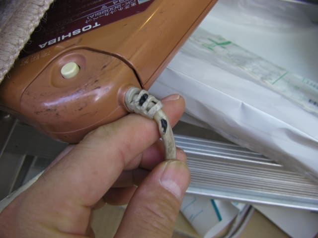 古いカーペットを確認すると、根元のコードが切れてスパークしていました。